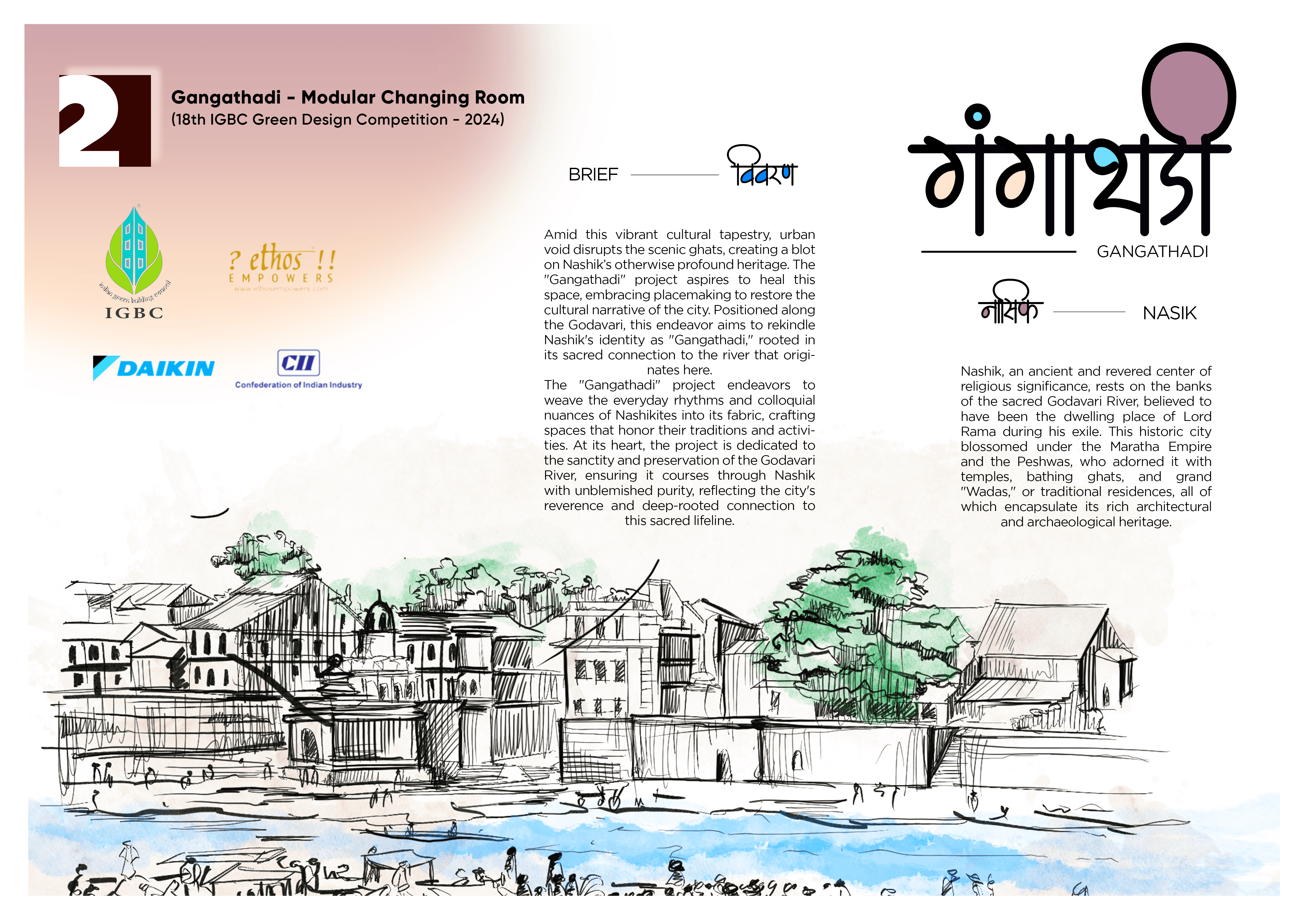 Amid this vibrant cultural tapestry, urban void disrupts the scenic ghats, creating a blot on Nashik’s otherwise profound heritage. The “Gangathadi” project aspires to heal this space, embracing placemaking to restore the cultural narrative of the city. Positioned along the Godavari, this endeavor aims to rekindle Nashik’s identity as “Gangathadi,” rooted in its sacred connection to the river that originates here.